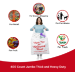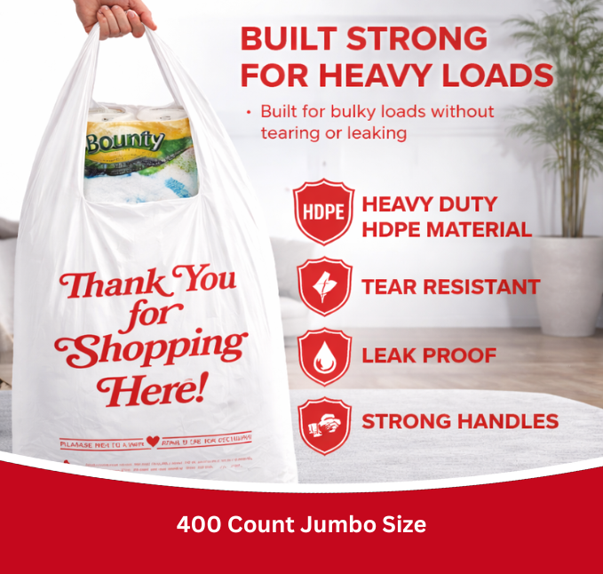 The classic t-shirt handle design ensures quick packing and comfortable carrying, improving efficiency at checkout counters or during busy hours. Whether you’re running a retail business or need reliable bags at home, this 400-count value pack gives you long-lasting supply and great cost efficiency.